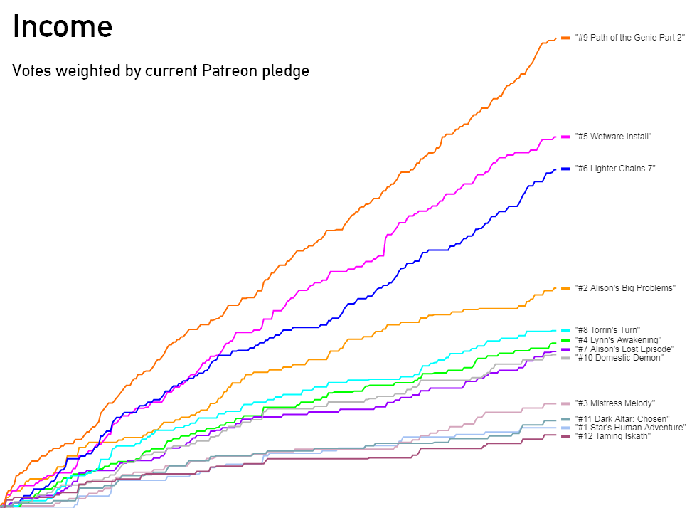 When the votes are arranged so that the oldest users (by patronage starting date) vote first, you can see a slight preference for Lighter Chains at the beginning. This makes sense as that would be the story that caused those users to join.